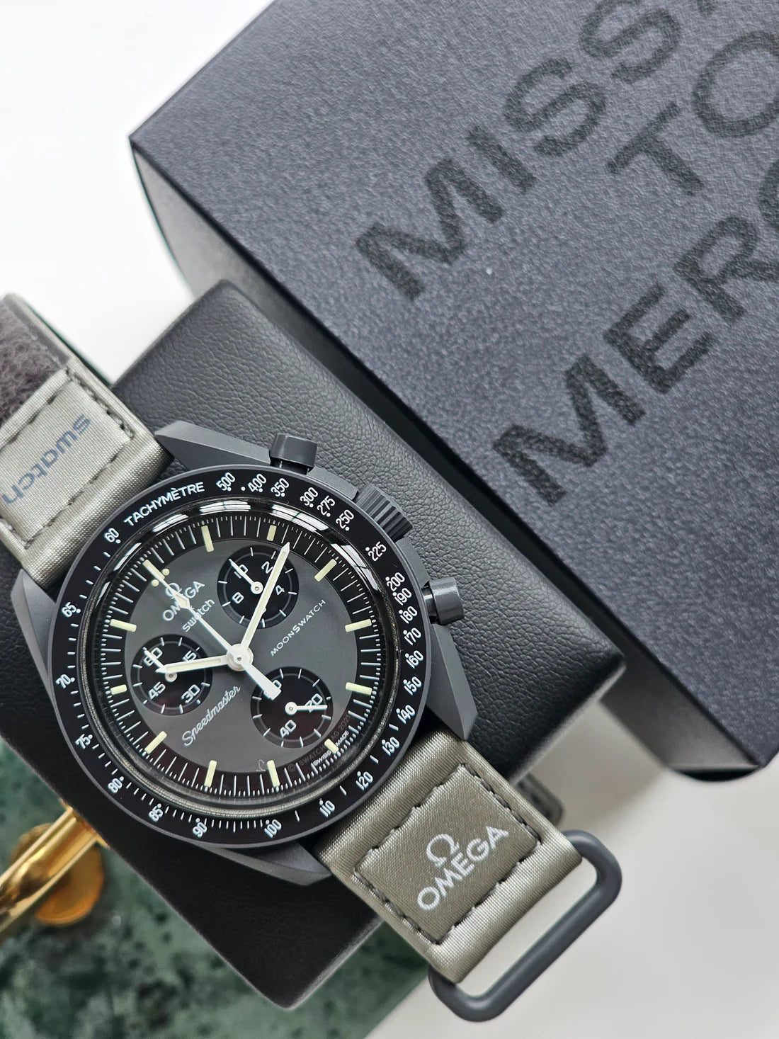 Sharp lugs, the "dot over 90" on the tachymeter bezel, and unique Bioceramic touch reflect dedication to detail. Superluminova illuminates hour markers, hands, and chronograph seconds for a radiant glow in the dark. The Mission to Mercury captures these elements, adorning your wrist with sophistication, precision, and a touch of cosmic beauty.