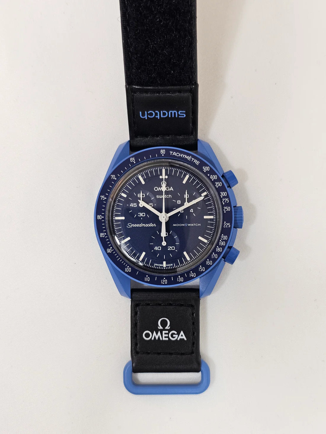 Dive into the depths of the night with the OMEGA X SWATCH Mission to Neptune MoonSwatch. Crafted for those who have an affinity for the enigmatic allure of the dark, this watch marries deep navy blue tones with a robust black VELCRO© strap. An epitome of contrast and clarity, the chronograph seconds hand, subdial hands, and tachymeter scale are presented in pristine white, making time-reading a breeze even in low light.